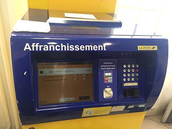 一進門我就看到一堆人在操作這些機器,然後我就猜想是不是郵票自動販賣機呢?果然!在法國,不需要排隊等著買郵票,除非你要買有漂亮圖案的那種傳統郵票,要不然任何包裹都可以在這邊稱重,付款,和打印郵票。相當方便!機器甚至可以切換語言(左上角有個國旗標誌可以切換,但只有英文和法文的選項)所以不會法文,相信我你還是可以活得好好的。接著照著機器指示,稱重,選擇寄送物品,寄送方式,寄送國家等,卡片付錢,然後把機器吐出來的郵票貼上就萬事ok啦!